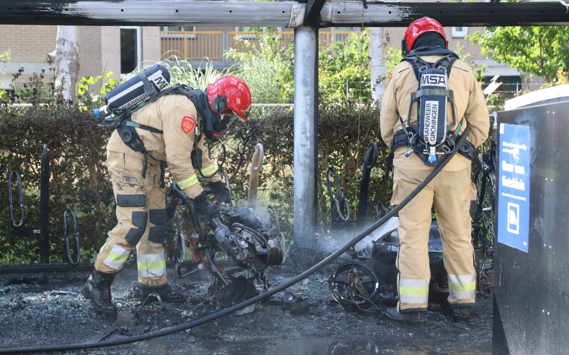 De brandweer was snel ter plaatse, maar kon de scooters niet redden. De brand veroorzaakte veel schade, onder meer aan de fietsenstalling. Ook een aantal fietsen en deelscooters in de stalling raakten beschadigd