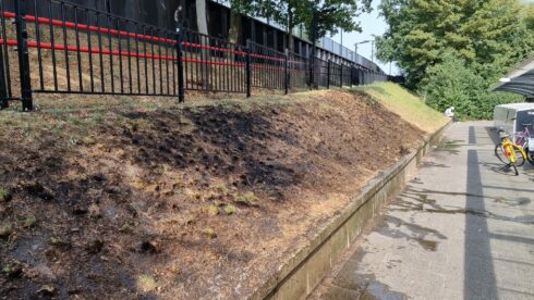 Bij het Noorderstation, aan de zijde van de Van Oldenbarneveltlaan, heeft zondagmiddag een deel van het talud in brand gestaan. Dat meldt nieuwsfotograaf Patrick Wind van 112groningen.nl.