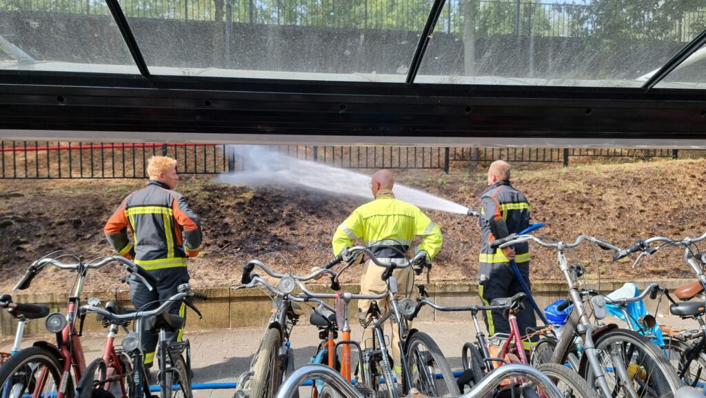 De melding van een natuurbrand kwam rond 14.00 uur binnen waarop een tankautospuit ter plaatse werd gestuurd. “De brand ging gepaard met flink wat rookontwikkeling”, vertelt Wind. “Door nog onbekende oorzaak heeft het talud, bij de fietsenstalling, vlam gevat. Dit talud bestaat uit gras en heide en is door de geringe hoeveelheid neerslag van de afgelopen periode erg droog geworden.”