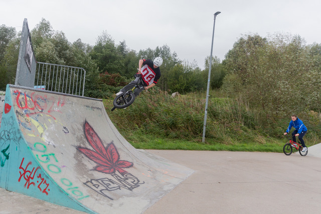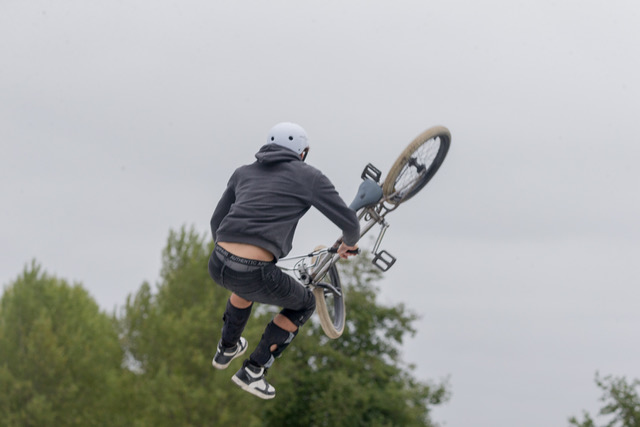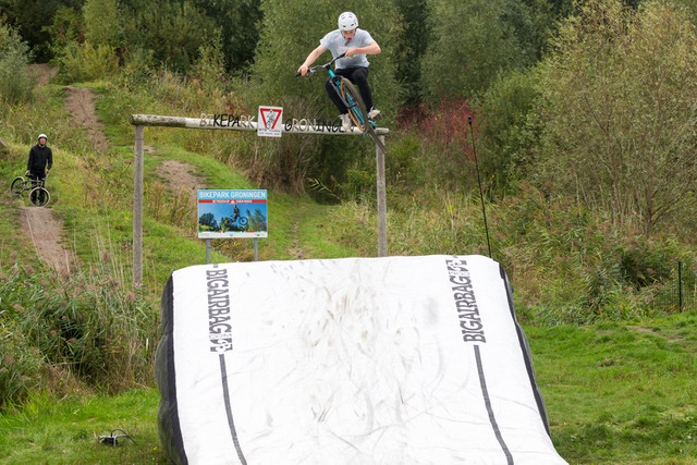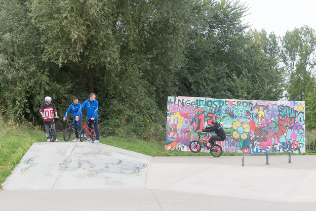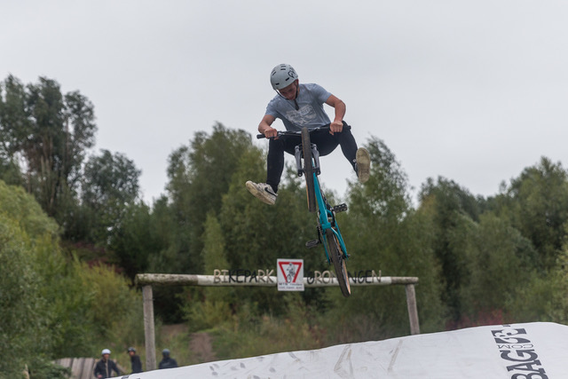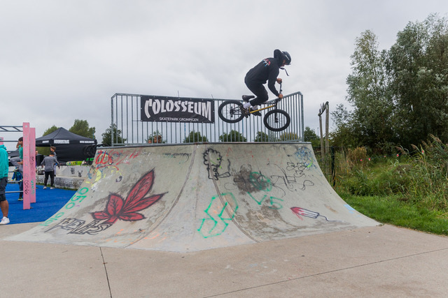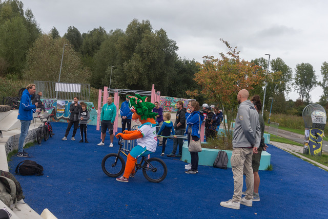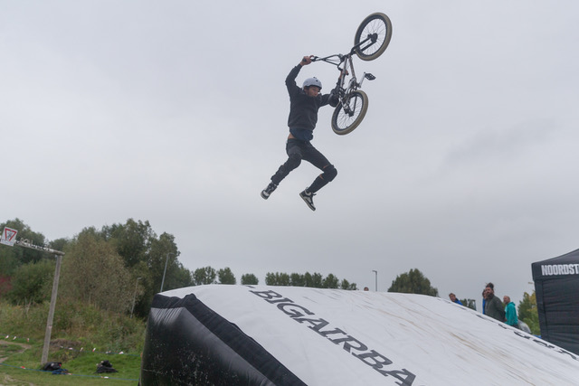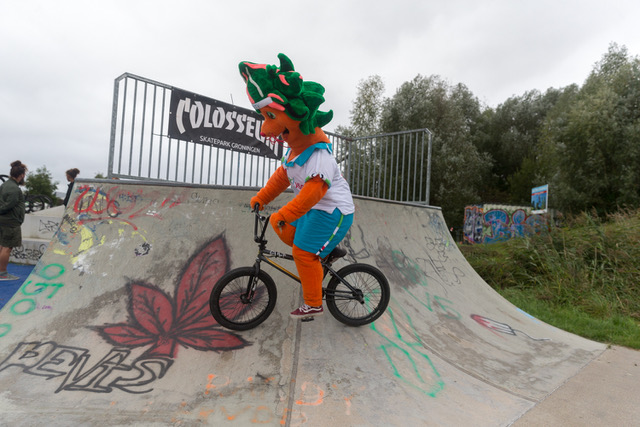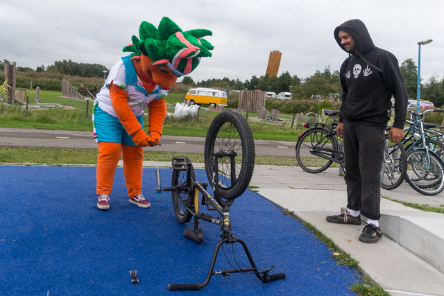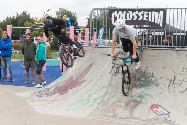 “De weergoden zijn ons goed gezind vandaag”, zegt Tjoelker. “Het is nagenoeg droog gebleven en we hebben hier vandaag een hele leuke dag. In de ochtend was het nog rustig, maar vanaf het begin van de middag kwam er een flinke aanloop op gang. Jongeren die het BMX’en willen proberen, die willen skaten, freerunnen of breakdancen. We organiseren verschillende wedstrijden waarbij er ook wat prijzengeld beschikbaar is gesteld. En het ziet er inderdaad spectaculair uit. Zo staat er hier een schans waar een jump kan worden gemaakt, waarbij men dan in een airbag belandt.”