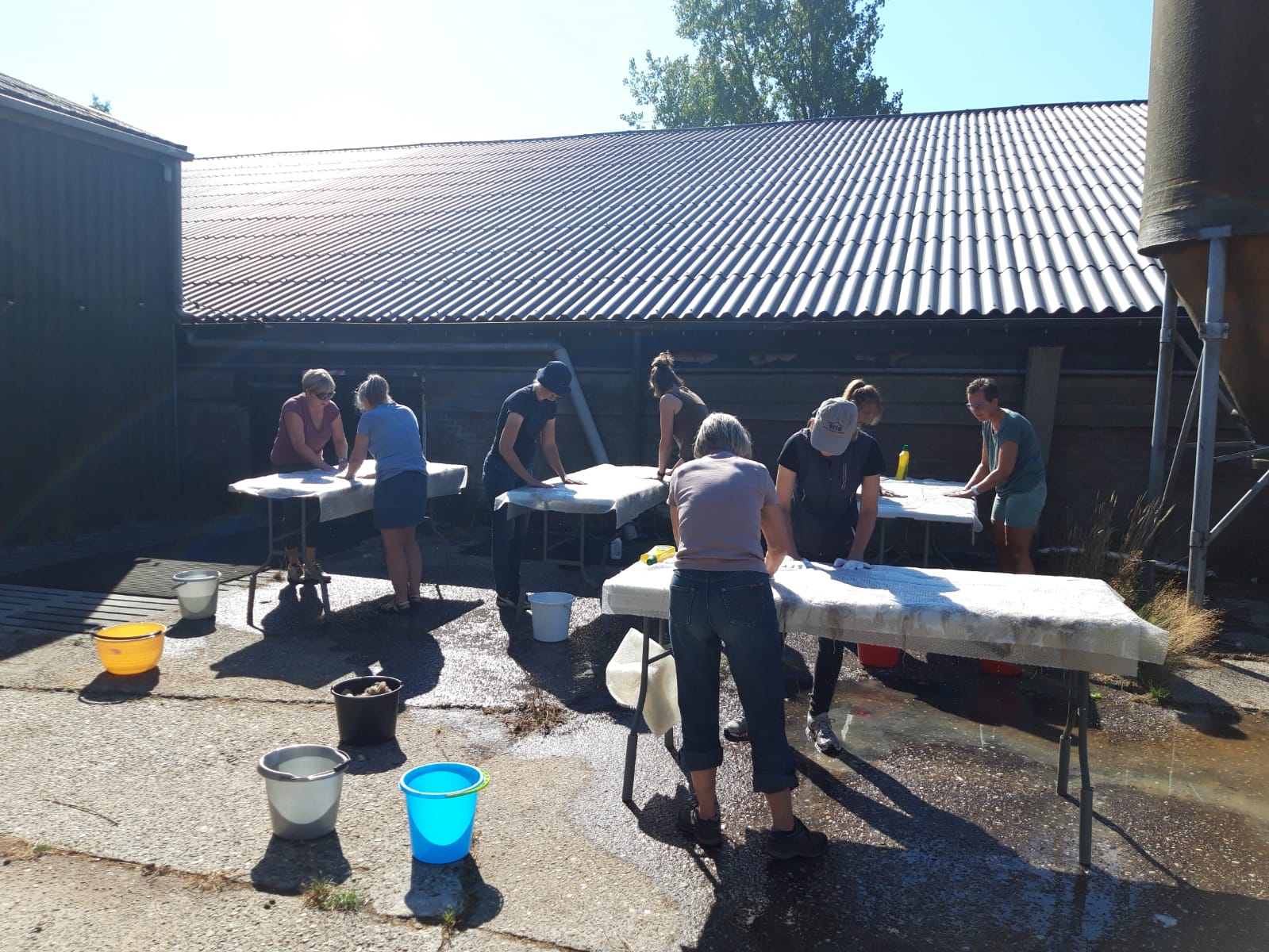 Bij de workshop wordt er achter hoge tafels gewerkt met water en zeep. Foto: Annemieke van den Berg van Saparoea