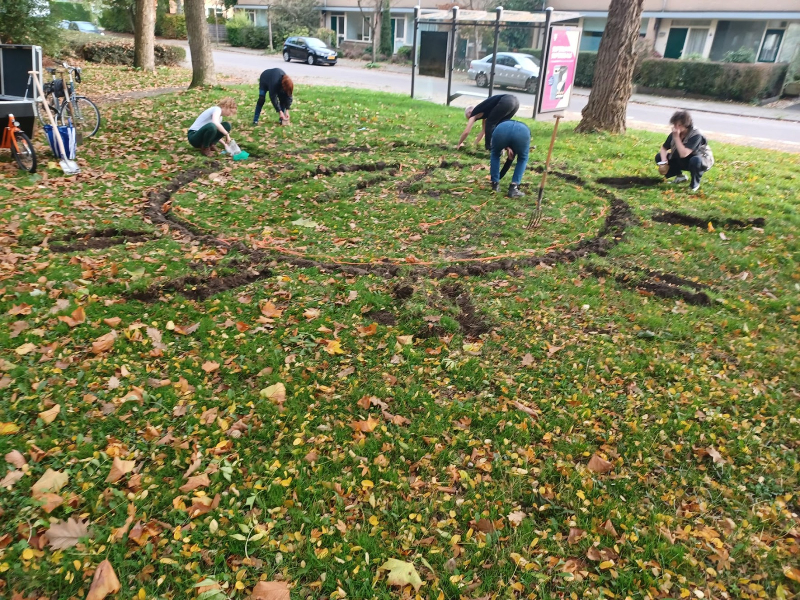 “Dat kun je wel zeggen. Eén van de mensen die vierkant achter dit project stond is onlangs, en geheel onverwachts, overleden. In eerste instantie wilden we deze actie ook afgelasten. Maar toen zeiden we, als er iemand is die zou willen dat we doorgaan, dan was het Wil wel. Wil was ontzettend bezig met biodiversiteit. Ze had midden in Paddepoel ook een eigen wilde tuin, met een vijver en kikkers. Ze was dedicated to biodiversiteit. Haar partner is kunstenaar en op de locatie aan de Planetenlaan hebben we een cirkel gemaakt. Een cirkel in de vorm van een zon met in het midden de letter ‘W’ gemaakt met bloembollen. Ter nagedachtenis. Ja, mooi. Een mooie herinnering aan Wil.”