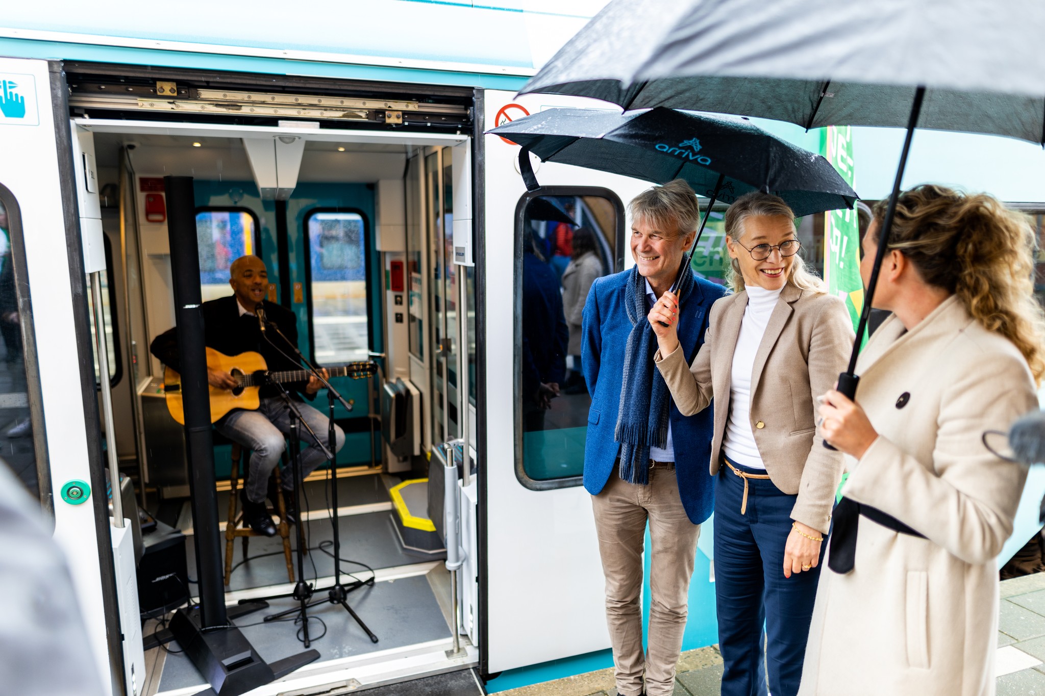 Vanaf vandaag kun je de Martinitoren niet alleen beklimmen, maar er ook in reizen door Noord-Nederland. Onder begeleiding van muzikant Arnold Veeman namen genodigden donderdagmiddag een kijkje in ‘D’ Olle Grieze’, de nieuwste WINK-trein van Arriva, op het Hoofdstation van Groningen.