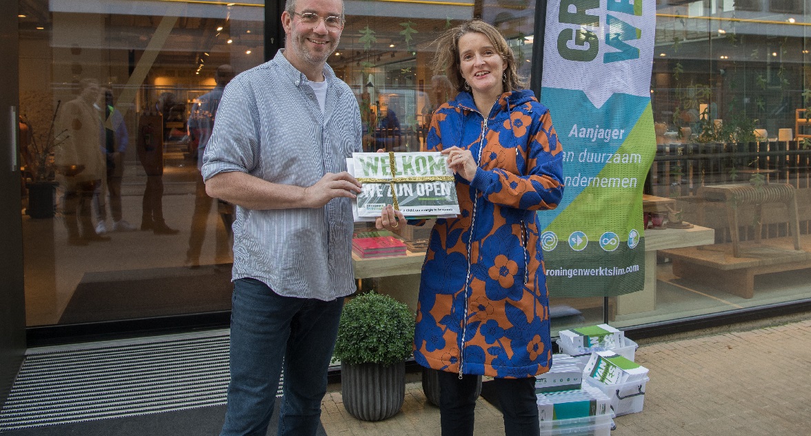 De eerste bordjes samen met een energiebesparingspakket werden vrijdagmiddag in het centrum van Groningen uitgedeeld. Dat gebeurde onder meer door wethouder Carine Bloemhoff: “Het is belangrijk dat de ondernemers nu gefaciliteerd worden. Er gaat nog veel energie verloren, onder meer door openstaande deuren. De deur dicht bespaart energie en geld. Maar er zijn nog meer besparingsmogelijkheden, daar voorziet dit pakket in”.