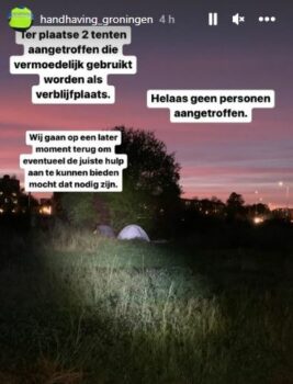 “We kregen een melding binnen van een tentenkamp dat was aangetroffen”, schrijven de Handhavers. “Op de locatie troffen we twee tenten aan, die waarschijnlijk gebruikt worden als verblijfplaats. We hebben tijdens ons bezoek helaas geen personen aangetroffen. We komen op een later moment terug, om eventueel de juiste hulp te kunnen bieden mocht dit nodig zijn.”