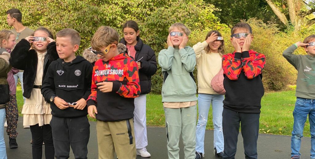 Ook de leerlingen van IKC Borgman in de Oosterparkwijk keken, samen met sterrenkundige Jeffrey Bout, rond het middaguur omhoog. Zij kregen in de ochtend een gastles, waarna de leerlingen naar buiten konden om (met eclipsbril op) te zien hoe de zon een hapje verloor.