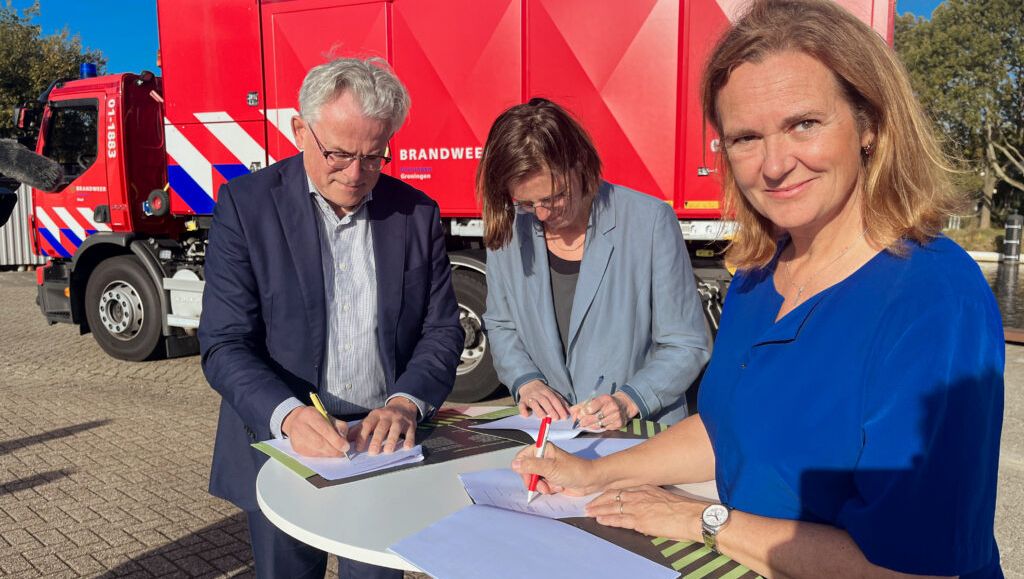 De Veiligheidsregio Groningen en het Waterbedrijf Groningen blijven samenwerken bij de levering van bluswater in onze provincie. Daarvoor zetten burgemeester Koen Schuiling en WG-directeur Riksta Zwart vrijdagochtend een handtekening onder een nieuw samenwerkingsconvenant.
