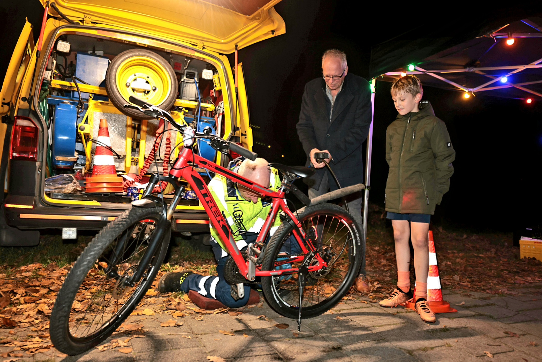 Philip Broeksma, wethouder en voorzitter van de stuurgroep Groningen Bereikbaar trapt fietscheck actie af en controleert de fiets van een deelnemer. Foto: Jan Buwalda