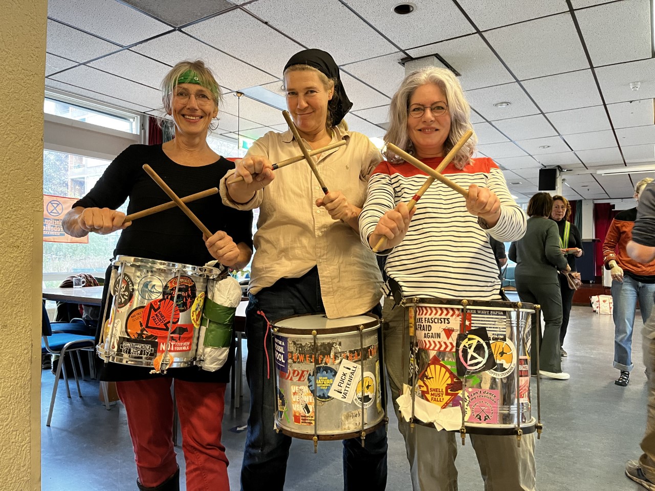 Door een optocht met drums en feestelijke kleding trapten de deelnemers van XR de Green Week af. De voorbereidingen daarvoor waren vanaf de ochtend tot in de vroege middag in buurtcentrum Plutozaal. Leden oefenden hard om het drummen onder de knie te krijgen. En dat was nodig, aangezien de meesten er onervaren in waren.