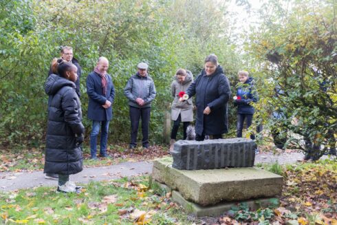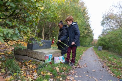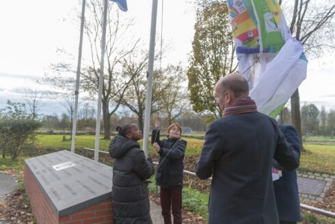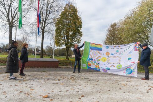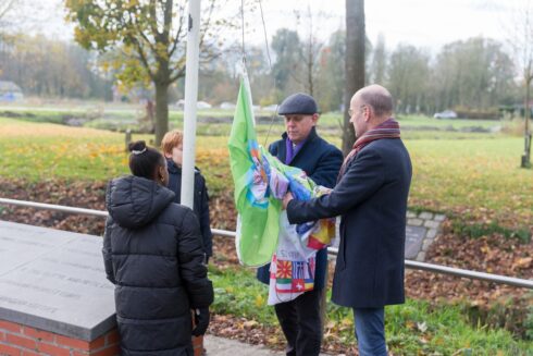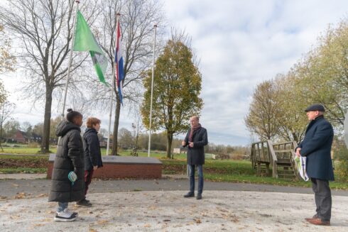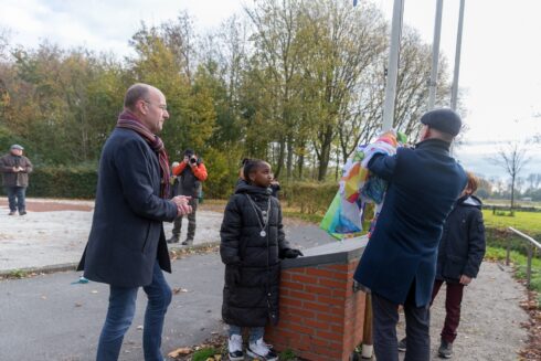 “Ieder jaar nodigen we een school uit die een vlag mag ontwerpen. Dit jaar was dat basisschool Het Palet uit de wijk Beijum. De vlag die zij gemaakt hebben werd in het Bevrijdingsbos gehesen. Daarnaast wappert eenzelfde vlag bij de school. Door kinderburgemeester Fatoumata en loco-kinderburgemeester Finn zijn er bloemen gelegd bij het beginpunt van het Kinderrechtenpad.”