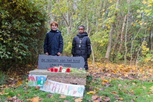 “De rechten van het kind zijn sinds 20 november 1989 officieel vastgesteld in het kinderrechtenverdrag van de Verenigde Naties. Nederland bekrachtigde het Kinderrechtenverdrag op 8 maart 1995. Sinds dat jaar heeft het Bevrijdingsbos een uniek Kinderrechtenpad. Langs dit pad staan tien stenen met daarop de tien rechten van het kind. Dan hebben we het over situaties waar kinderen van hun geboorte tot hun achttiende levensjaar mee te maken kunnen krijgen. Het gaat bijvoorbeeld over voeding, school, wonen, gezondheid, mishandeling, kinderarbeid, oorlog en vluchten.”