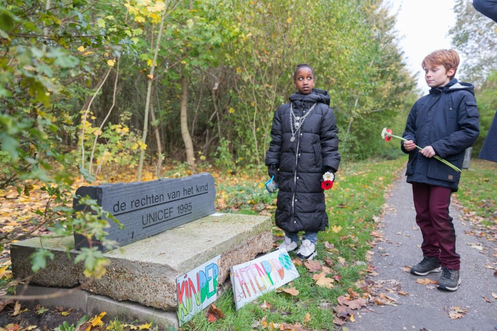“Ieder jaar nodigen we een school uit die een vlag mag ontwerpen. Dit jaar was dat basisschool Het Palet uit de wijk Beijum. De vlag die zij gemaakt hebben werd in het Bevrijdingsbos gehesen. Daarnaast wappert eenzelfde vlag bij de school. Door kinderburgemeester Fatoumata en loco-kinderburgemeester Finn zijn er bloemen gelegd bij het beginpunt van het Kinderrechtenpad.”