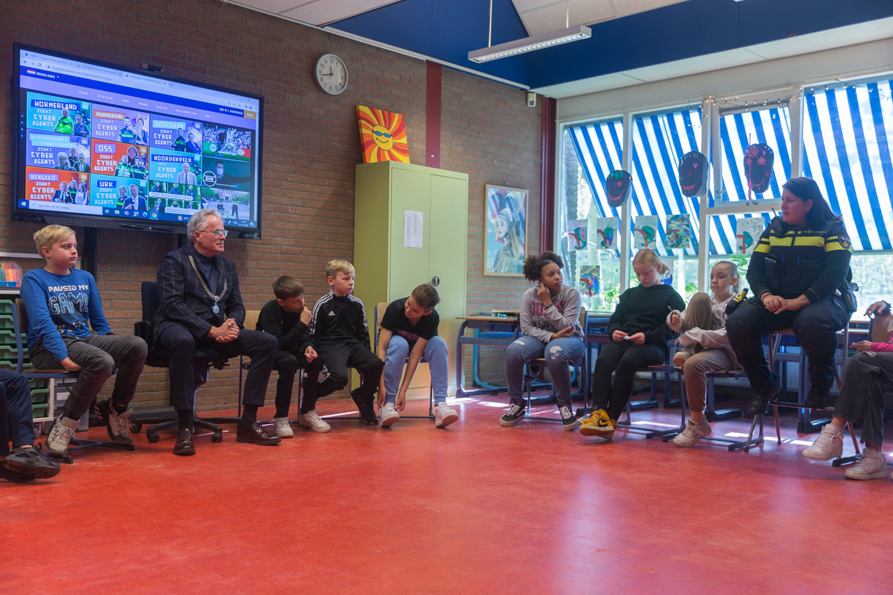 In aanwezigheid van burgemeester Koen Schuiling en de politie kregen de leerlingen les over ‘online gevaren’, zoals hacken en foto’s delen. Schuiling en een politieagente beantwoorden vragen van kinderen.