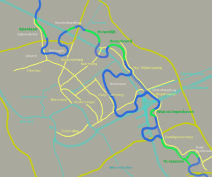 Hoe gaat het er straks uitzien? In de voorkeursvariant is de hellingbaan van de nieuwe brug, de verlegging van de Ulgersmaweg en de aanleg van een nieuwe fietsverbinding langs het Van Starkenborghkanaal opgenomen. Besloten is om de oorspronkelijk Hunzeloop in de Hunzeboord door te trekken en te verbinden met de loop langs de Hunzedijk, waarmee een nieuwe open waterverbinding ontstaan. Hiermee wordt een deel van de Hunze hersteld en wordt de loop weer zichtbaar en beleefbaar gemaakt. De komende periode zal onderzocht worden of het waterpeil van de Hunze kan aansluiten op het peil van het Van Starkenborghkanaal, via het Boterdiep. Met deze peilverhoging wordt het stroomgebied hersteld, de beleving versterkt en kan ook de ecologische waarde worden vergroot.