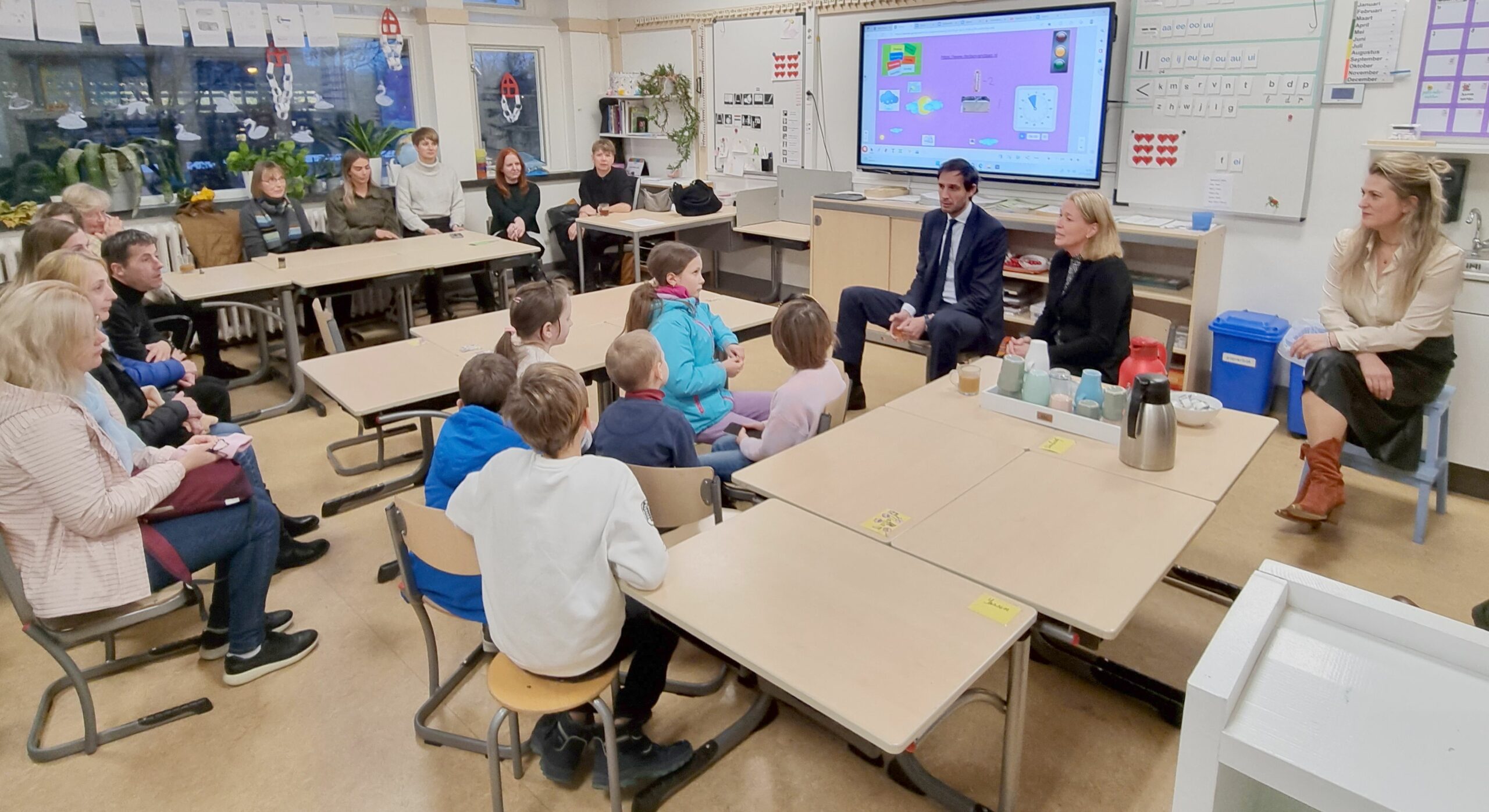Minister Hoekstra van Buitenlandse Zaken ging maandagmiddag in gesprek met Oekraïense kinderen en hun ouders op de nieuwkomersschool van basisschool De Kleine Wereld aan de S.S. Rosensteinlaan.