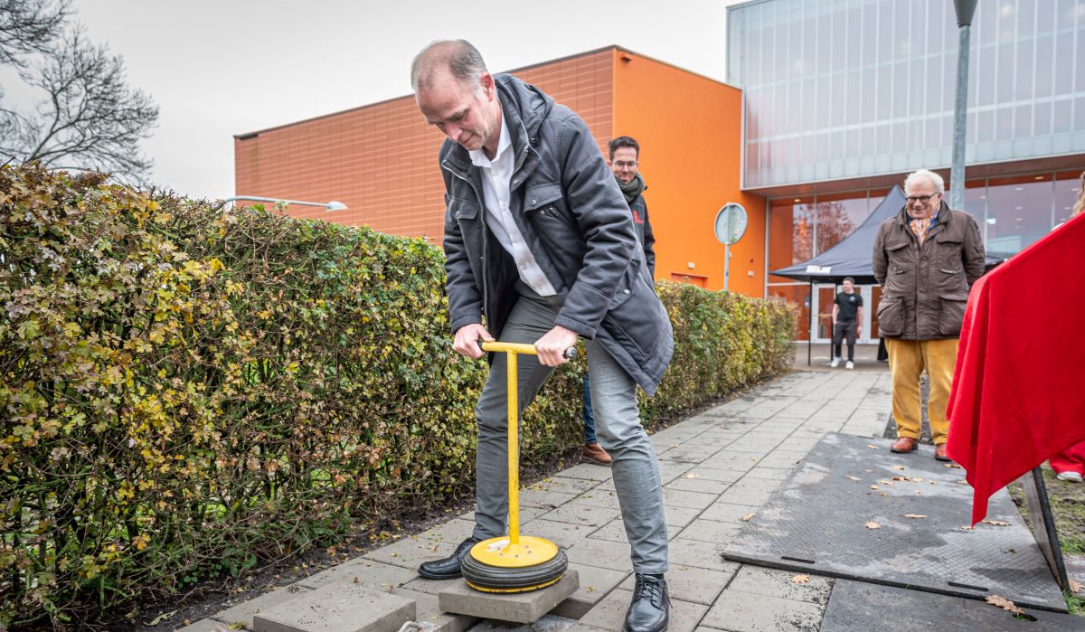 Edward van der Meer, directeur van Campus Groningen, plaatste dinsdagmiddag de laatste tegels voor het speciale stukje voetpad, wat bij hevige regenval voor minder wateroverlast moet zorgen. Naast het pad werd een informatiebord onthuld, wat de gebruikers van het pad laat weten waar ze overheen lopen.