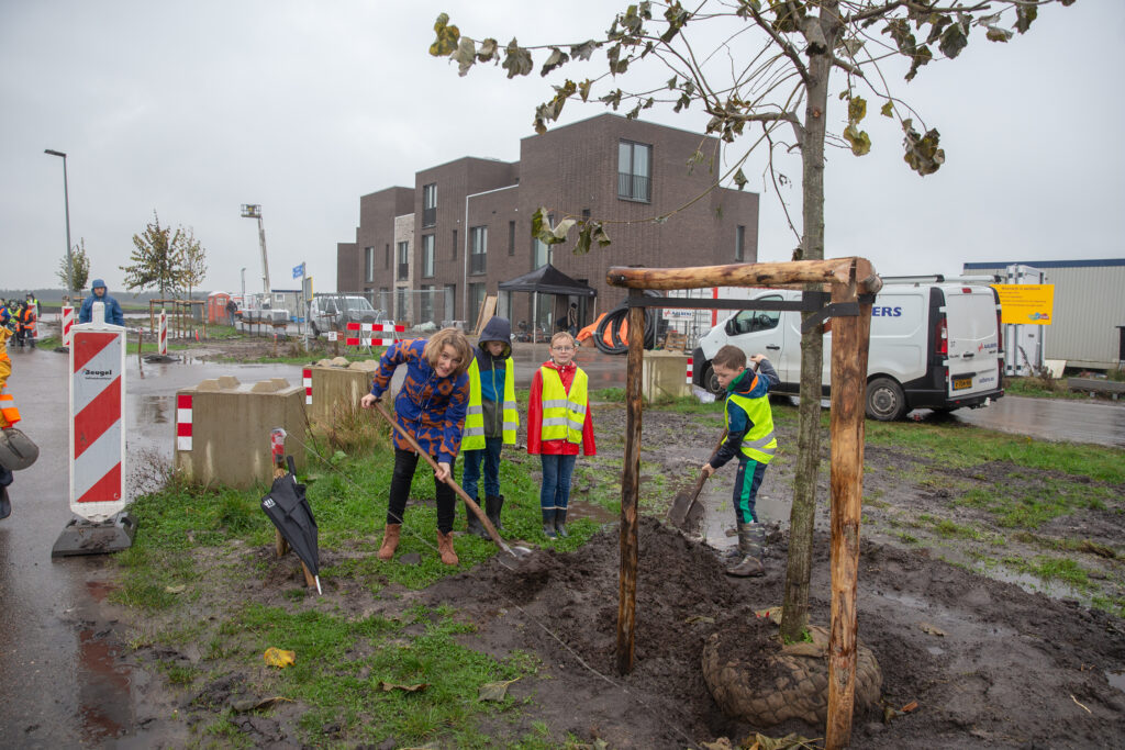 Bloemhoff en de kinderen hebben verschillende bomen geplant aan de Vossenburglaan in Meerstad. Het thema van de Boomfeestdag van dit jaar is: (met) Bomen Werken.