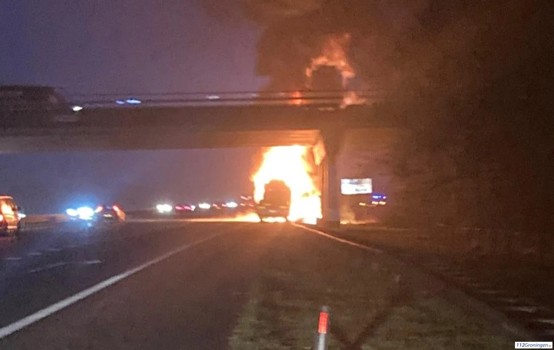 Het verkeer op de A7 tussen Groningen en Drachten kan weer rijden. De weg was ter hoogte van Frieschepalen urenlang versperd door een kraanwagen die in brand stond.