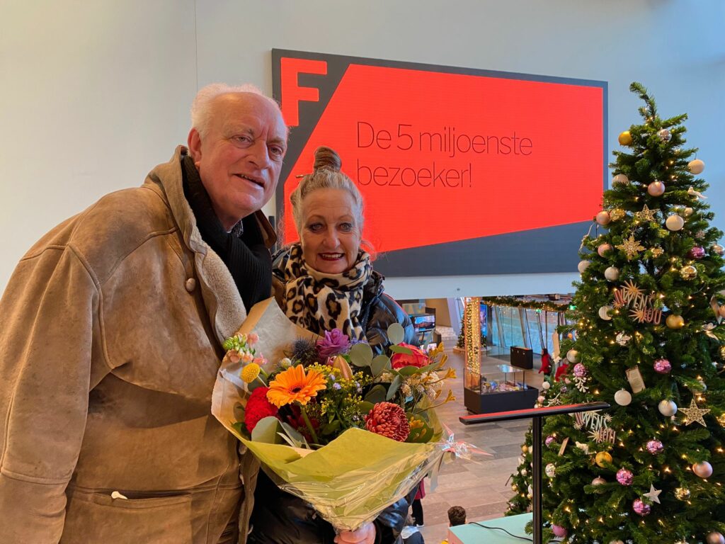 Simon en Immy Mast uit Groningen werden daarom in de bloemen gezet. Het paar kwam naar het Forum om te genieten van het mooie uitzicht op het dak en om even wat te drinken. Ze waren zeer verrast dat zij de vijf miljoenste bezoekers waren.