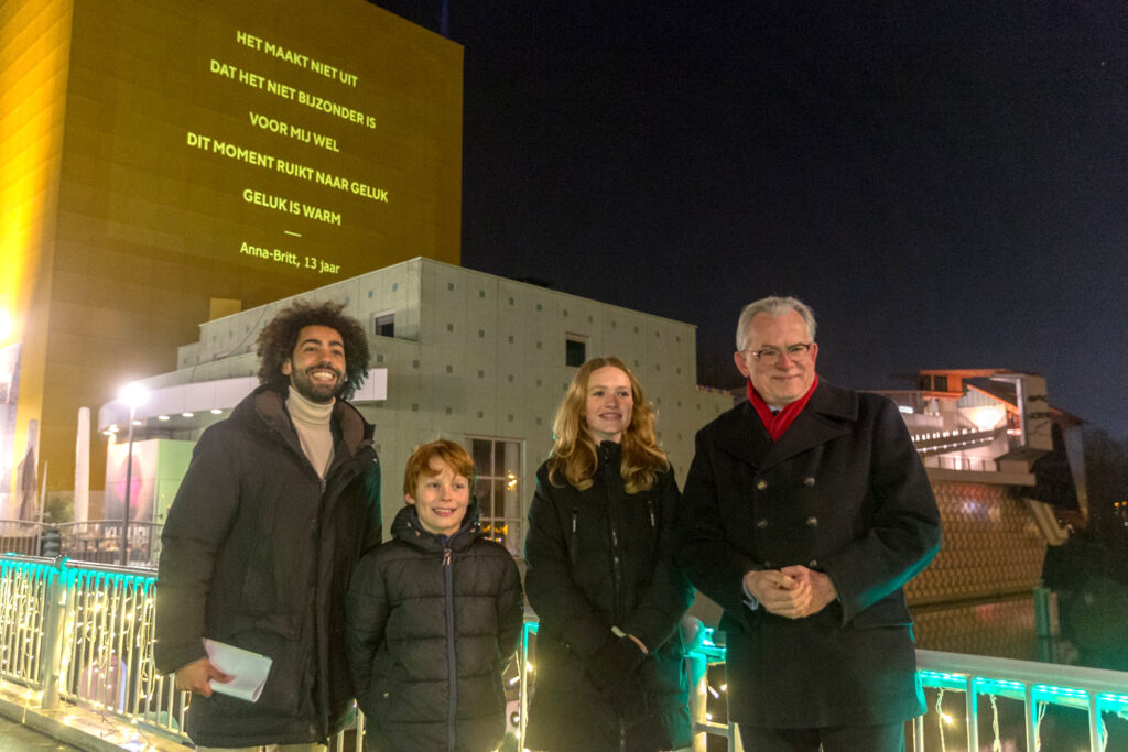 Met een druk op de knop verrichtte de dertienjarige Anna-Britt Krol maandagavond de opening van de derde ‘energiezuinige’ editie van het lichtkunst-evenement Poetry by Night. Tot en met 31 december zijn door de hele gemeente projecties, verlichte banieren en lichtzuilen te zien met poëzie.