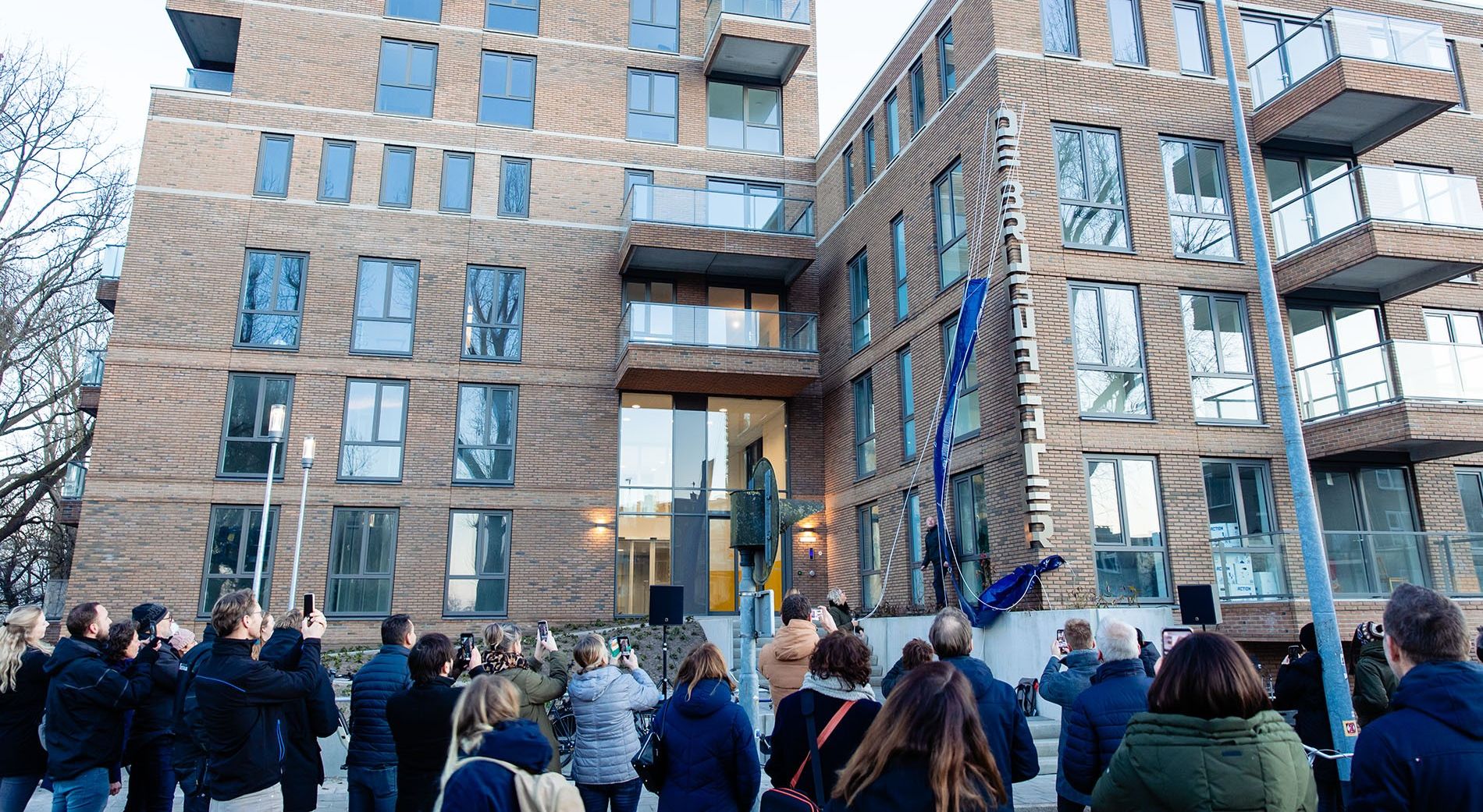 Gebiedsmanager Miranda ten Cate van Lefier en Inge Bergsma, de bedenkster van de naam ”De Brugwachter’, trokken het doek van de naam op de gevel. Daarna was er een korte rondleiding door het gebouw, waarbij onder meer werd stilgestaan bij de muurschilderingen in de centrale hallen van de woontoren.