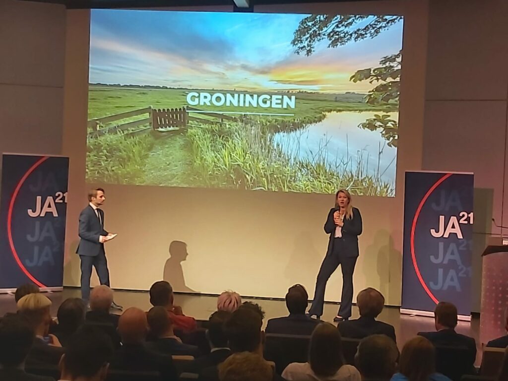 JA21 is voorstander van het open houden van de gaswinning in Groningen. Van Scherpenzeel stelde maandagavond, tijdens de start van de JA21-campagne voor de vierkiezingen, dat Groningers te weinig zelf aan het woord komen over hun situatie rond de aardbevingen in het gebied: “Er wordt heel veel over Groningen gepraat, maar er wordt niet mét de Groningers gepraat. Daar gaat JA21 verandering in brengen.”