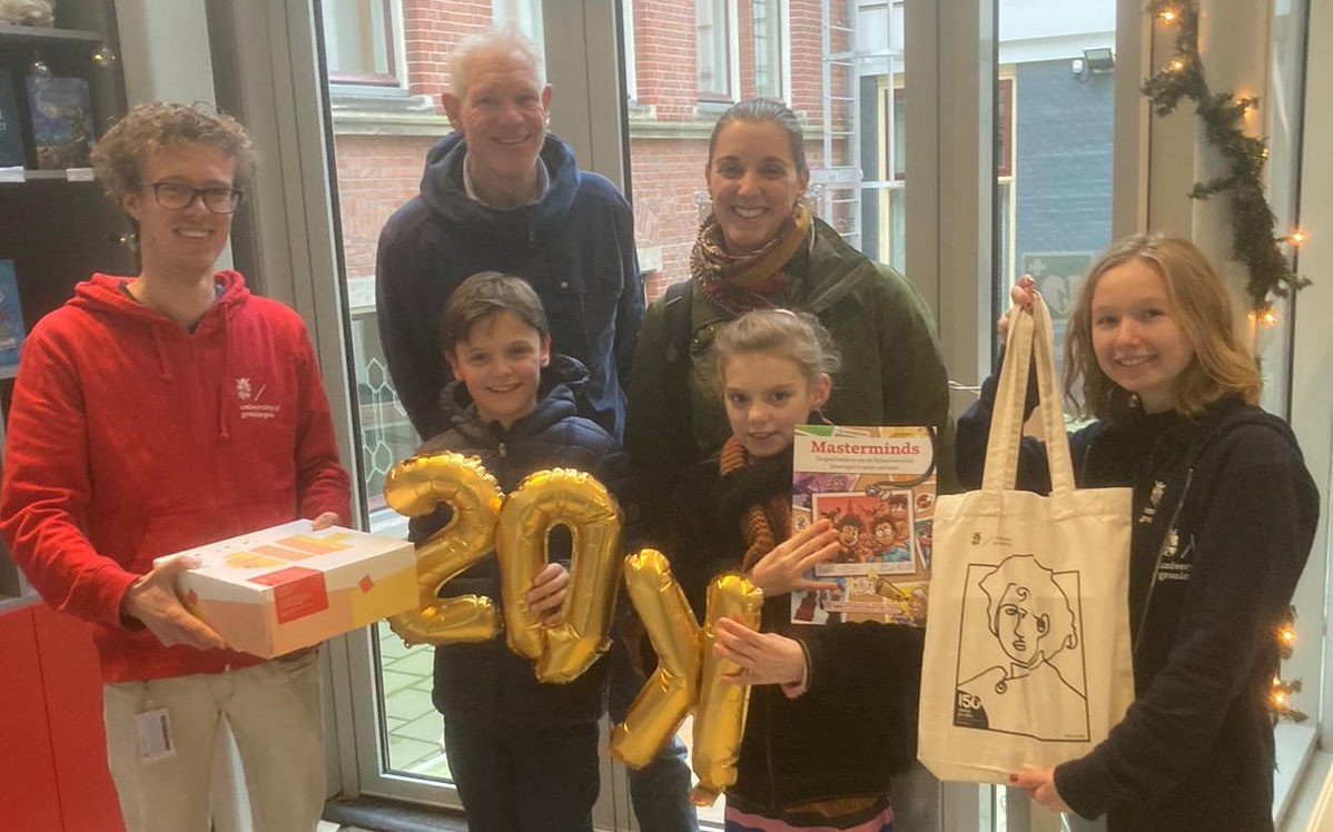 Een feestelijke moment vrijdagochtend bij het Universiteitsmuseum van de Rijksuniversiteit Groningen. Voor het eerst wordt een bezoekersaantal van 20 duizend in één jaar bereikt.