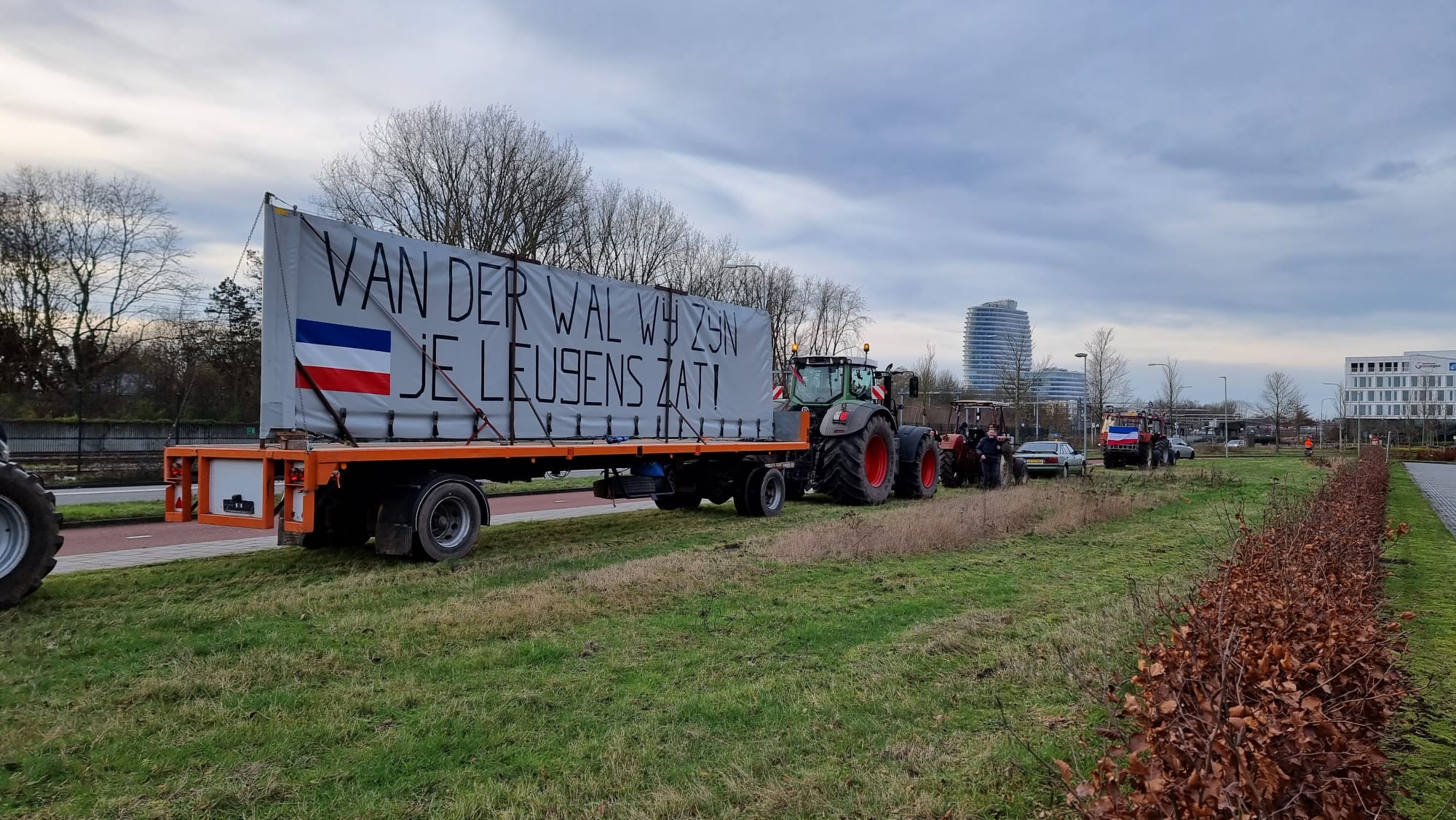Even na de klok van 15.00 uur reed een colonne van vijf trekkers en verschillende volgauto’s door Stad. “Achter één van de trekkers hangt een kar met daarop een groot bord met de tekst ‘Van der Wal wij zijn je leugens zat’. Men is naar de Mediacentrale gereden en daar staat men nu voor het pand”, vertelt nieuwsfotograaf Patrick Wind. “Aanvankelijk wilde men het gebouw binnenlopen, maar de deur bleek op slot te zijn.”