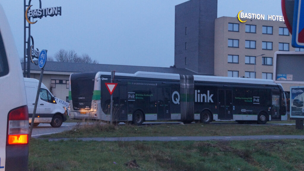 Een bus van Qbuzz blokkeerde maandagmorgen enige tijd de straat op de hoek van de Rigaweg en Winschoterweg.