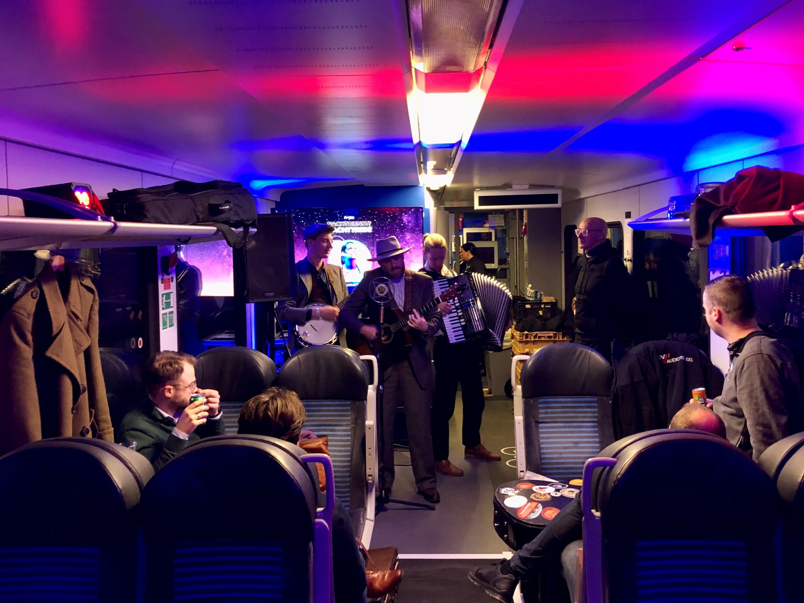 Zanger Gijs de Groot van Them Dirty Dimes: “Het was echt heel leuk. Iedereen was zo enthousiast. Samen vertrek je middenin de nacht naar Schiphol en onderweg leer je elkaar beter kennen. Ook kunnen we zo na een optreden in Amsterdam weer vroeg terugreizen naar Groningen.” De nachttrein tussen Groningen en Schiphol zal vanaf nu tijdens elke nacht van vrijdag op zaterdag rijden. Om 01.48 uur vertrekt de trein uit Groningen. Via Assen, Zwolle, Lelystad en Almere komt de trein om 03.51 uur aan op Schiphol. Om 05.07 uur vertrekt de trein vanaf Schiphol om op 07.22 uur weer te arriveren in Groningen. Een ticket voor de nachttrein kost tien euro en is te koop via Glimble, de reisapp van Arriva.