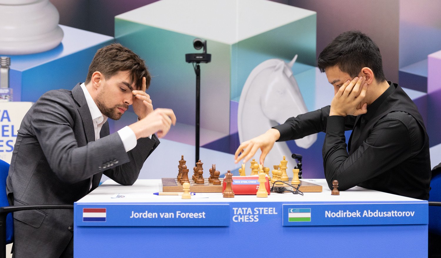 In een Siciliaanse opening werden de dames snel geruild. De stelling leek aanvankelijk in evenwicht, maar Van Foreest wist een klein voordeeltje te bereiken. Jorden won een paar pionnen, waarna Abdusattorov na 49 zetten opgaf. Zo deed Van Foreest wat terug voor de ontknoping van twee jaar geleden. Toen wist hij zeer verrassend het toernooi te winnen na een barrage tegen Giri.