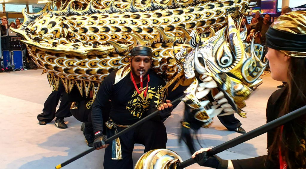 “Toch zeker wel 25 mensen. De Drakendans wordt uitgevoerd door negen mensen. Voor de Leeuwendans hebben we tien mensen nodig, en dan hebben we nog degenen die muziek maken. Dus je hebt het best wel over een grote groep. En weet je wat zo leuk is? Dat we het nu in Groningen op kunnen voeren. Wat ik je al vertelde, we zijn de hele wereld overgetrokken. Maar om zoiets in je eigen thuisstad te mogen doen, dat is toch wel heel erg fantastisch.”