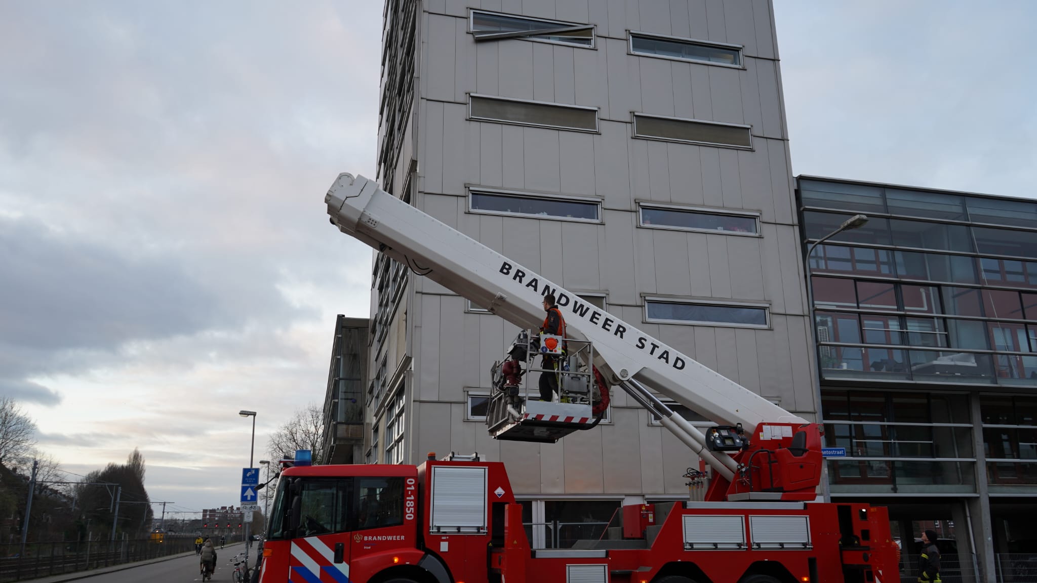 De melding kwam rond 16.30 uur bij de hulpdiensten binnen waarop een hoogwerker naar het adres werd gestuurd. “Het gaat om een gebouw dat op de hoek van de Verlengde Lodewijkstraat en de Esperantostraat staat”, vertelt de fotograaf. “Een zonnescherm is losgekomen van de gevel en dreigt naar beneden te vallen. De bewoner is direct in actie gekomen en heeft samen met een kennis het trottoir afgezet.”
