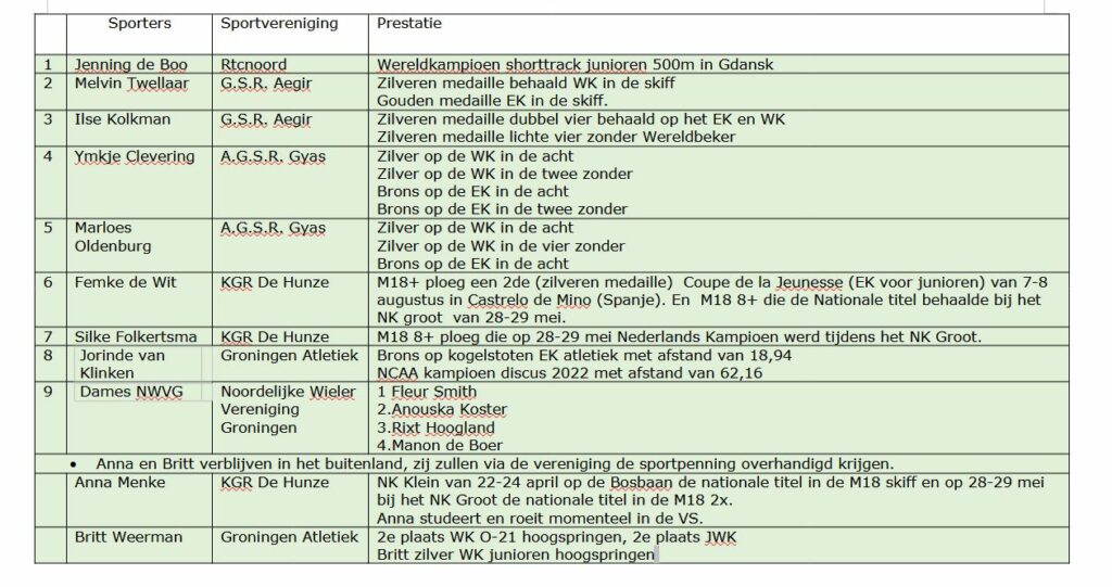 Naast de acht eerder genoemde sporters maakte de gemeente bekend dat ook roeister Anna Menke en hoogspringster Britt Weerman de sportpenning zullen ontvangen, maar zij zijn op dit moment niet in Nederland.