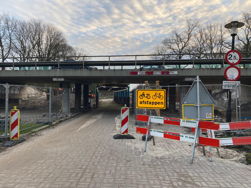 “Het is fijn dat de route door het Stadspark weer open is, en ook open kan blijven vanwege een corridor die is aangelegd onder de onderdoorgang”, vertelt voorzitter Wim Borghols. “Maar waarom is er nu een bord geplaatst waarop staat ‘fietsers afstappen’? Wat is de nut en noodzaak er van?” Borghols wijst daarbij naar het fietspad dat parallel loopt aan het Noord-Willemskanaal: “Op andere plaatsen moeten veel smallere routes gedeeld worden tussen fietsers, roeibegeleiders, Pieterpadlopers, scootmobiels en honden-uitlaters.”