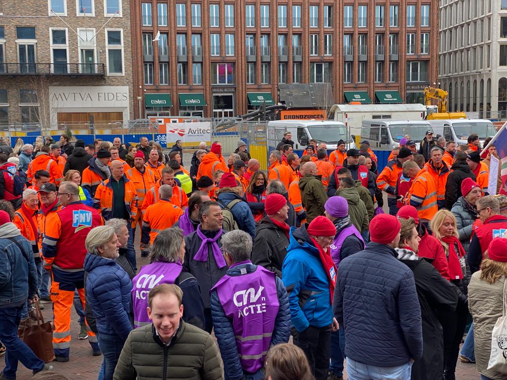 Samen met honderden andere gemeenteambtenaren kwamen Hage en Huising vandaag naar de binnenstad om hun stem te laten horen. ‘Uit de massale opkomst blijkt wel hoe groot de onvrede is’, zegt Kitty Jong van vakbond FNV. Volgens Jong kampen een hoop werknemers met financiële zorgen. ‘Het water staat hen aan de lippen, er moet geld bij komen.’