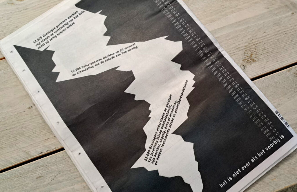 In de Volkskrant, het Parool, het AD en Trouw staat vrijdag een vrijwel geheel zwarte pagina, met daar doorheen een grote, witte scheur. De pagina is een advertentie van de Groninger Bodem Beweging.
