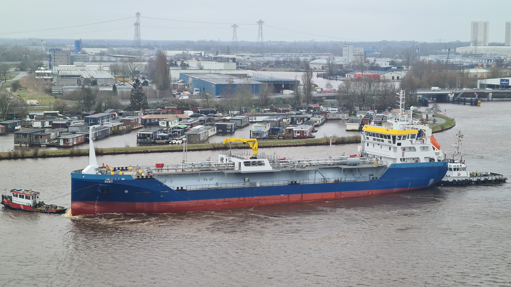 Twee sleepboten en een geleidend schip loodsten vrijdagochtend de 92 meter lange ‘Gust’ door het Winschoterdiep en het Eemskanaal.