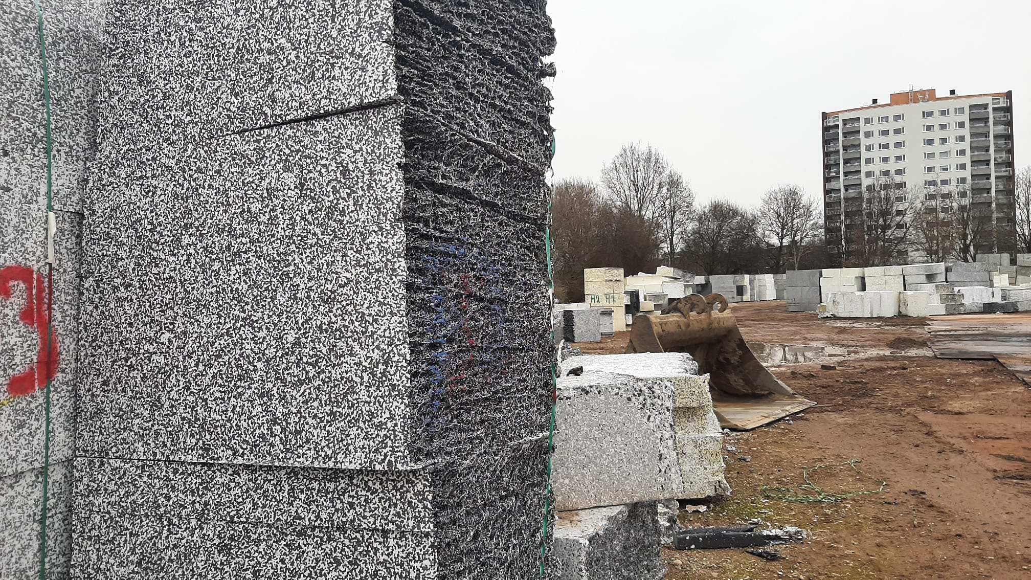 Eén van de laatste stapels gesmolten piepschuimblokken die maandagochtend nog op het terrein stonden - Foto: Sientje van Schie