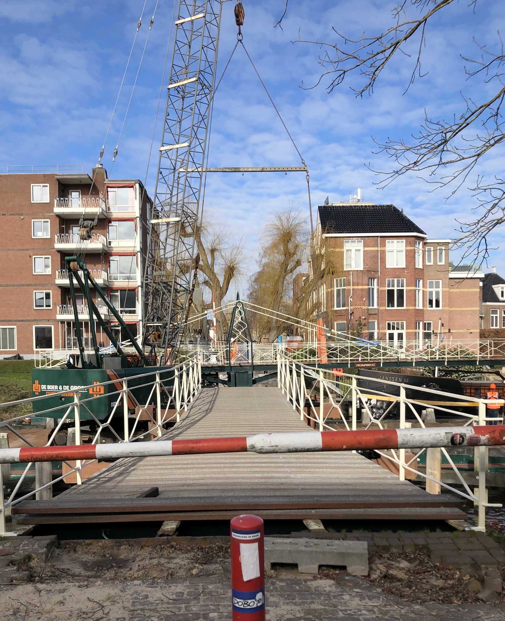 De renovatie duurde langer dan eerst was ingeschat. De brug zou eerst eind december worden teruggeplaatst, maar door een tekort aan materiaal om de brug veilig te kunnen plaatsen is dit met twee maanden uitgesteld. Vanmiddag werd alles weer op zijn plek gehesen, waarbij voorbijganger Herman Grimme een aantal foto’s heeft gemaakt.