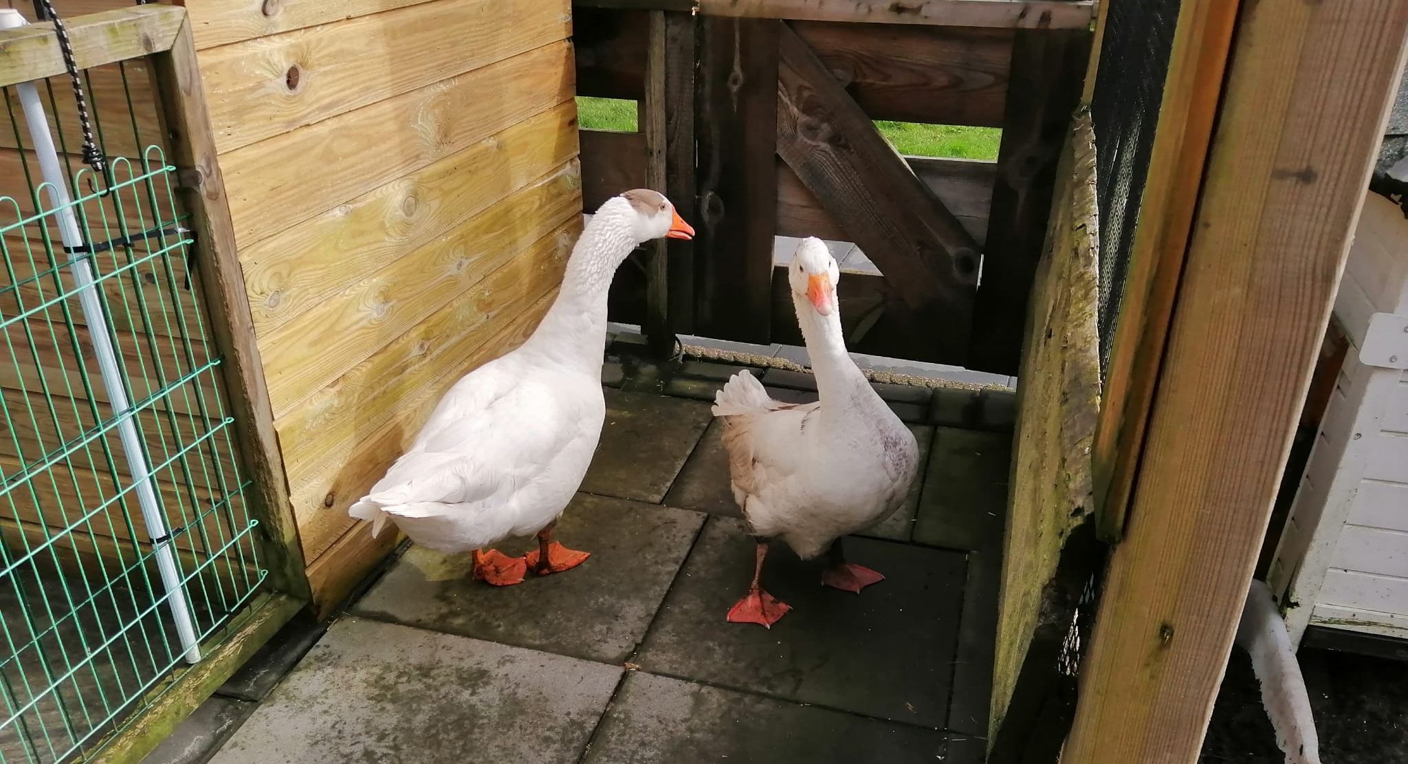 Na een verblijf bij de dierenambulance worden de watervogels nu verzorgd door Bikers 4 Animals. Bart en Leonie (vernoemd naar de medewerkers van de Dierenambulance die de ganzen hebben bevrijd) zetten dinsdagochtend hun eerste stapjes buiten, tussen de kippen van het opvangcentrum. En voorzichtig is nog zacht uitgedrukt, aldus Perdok: “Lichamelijk gaat het best goed met de ganzen, maar ze moeten nog wel steeds aansterken. Maar ze zijn nog steeds erg bang, vooral voor mensen. Ze mogen nu rondlopen tussen de kippen op een groot weiland.”