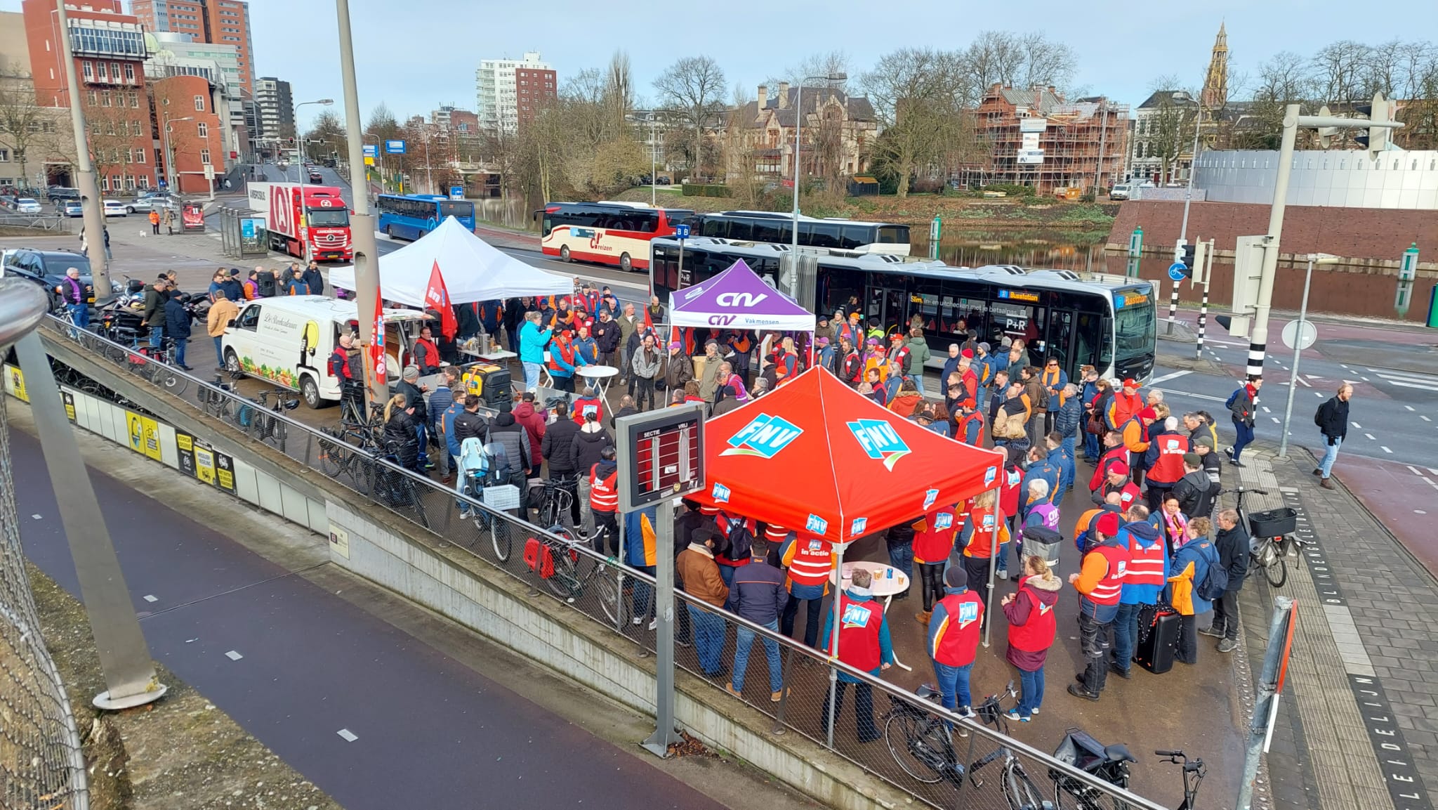 Vakbonden FNV en CNV zetten tentjes neer op de hoek van het Stadsbalkon bij het busstation. Daar verzamelden de buschauffeurs en andere medewerkers van vervoerder Qbuzz zich voor een manifestatie, om de acties in het streekvervoer kracht bij te zetten.