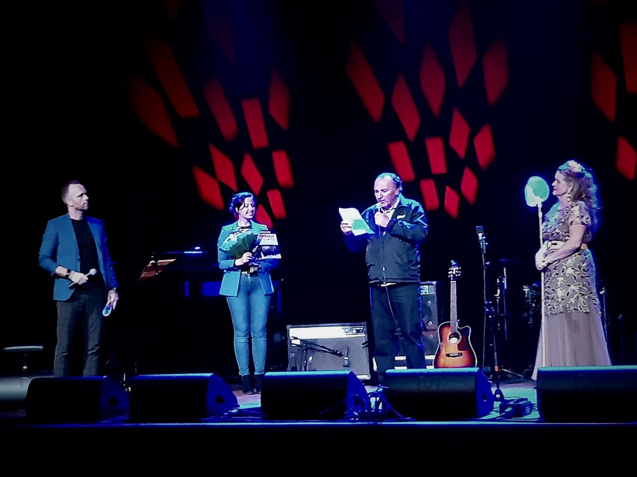 Het Grunner Laidjesfestival. Van links naar rechts: Dion Bouwes winnaar van 2017, Josien Bakker winnares van 2021 Robb Kaufmann van de A theater en org. presentatie en org. Tineke Rouw-Oosterhuis. Foto: Wouter Velzen
