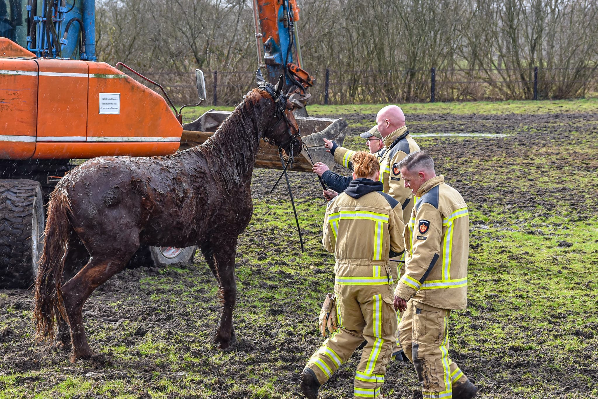 Aanvankelijk was het de bedoeling om met behulp van de kraan op de hulpverleningswagen het dier uit de sloot te takelen. “Dat lukte niet. De brandweerwagen kon niet bij de sloot komen, omdat het erg modderig is en de zware wagen al snel hopeloos vast zou komen te zitten. Al snel kwam er hulp van iemand die op een particuliere graafmachine aan kwam snellen. Met vereende krachten lukte het om het dier uit de sloot te takelen. Al snel stond het dier weer overeind, maar je kon duidelijk zien dat het paardje het flink koud had.”