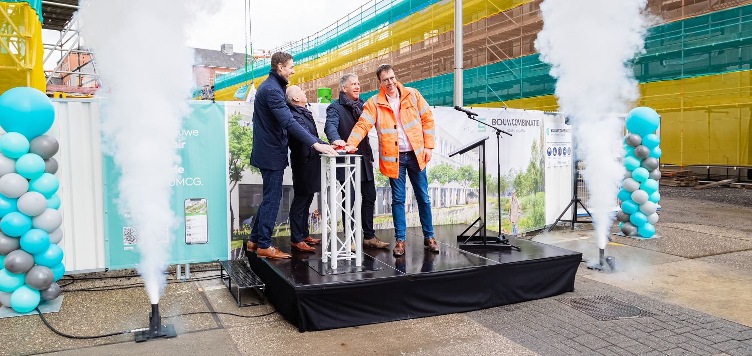 Vertegenwoordigers van aannemers BAM, Trebbe en Equans (BTE) hesen de vlag samen met bestuursvoorzitter Ate van der Zee van het UMCG.