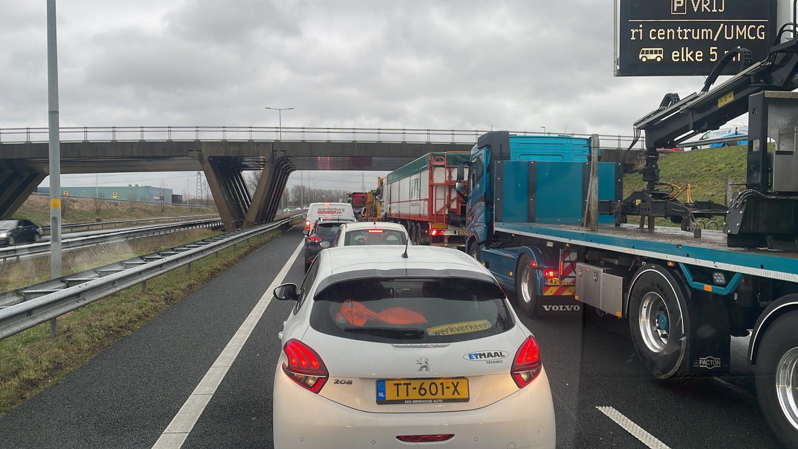 Door de werkzaamheden tussen Hoogkerk en Groningen-West ontstond tijdens de dinsdagochtendspits opnieuw een forse file.