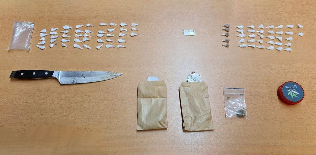In de tas zaten 75 bolletjes ‘wit’ (cocaïne), vijf bolletjes ‘bruin’ (heroïne) en twee zakjes hennep. In de tas zat ook een mes.