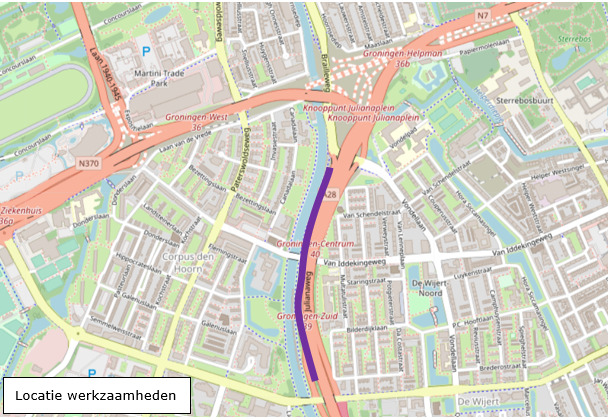 De komende drie weekenden wordt gewerkt aan de westzijde van de A28, richting Haren. De weg krijgt hier de nieuwe, definitieve inrichting. De A28 is drie weekenden dicht tussen het Julianaplein en afrit 39 (Groningen/Zuid).