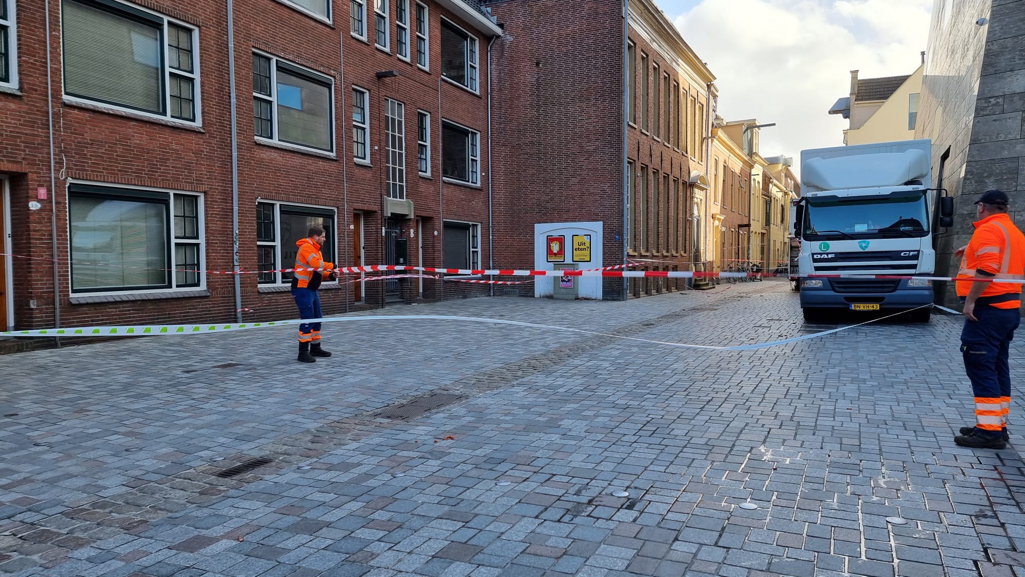 Zo werd de Schoolstraat afgesloten omdat er dakpannen van een aantal panden afwaaiden. De straat werd afgesloten, omdat meer pannen dreigden los te komen.