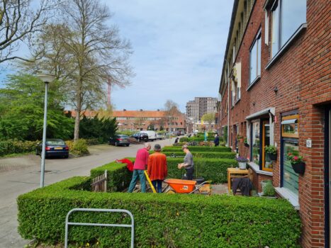 “Ik denk dat we met ongeveer veertig mensen bezig zijn. Er wordt hard gewerkt, maar we maken het ook gezellig. Zojuist hebben we samen geluncht, en eerder hadden we op de tafels koffie en thee staan. Dus je kunt gerust zeggen dat we vandaag de buurt mooier en groener maken, maar dat ook flink gewerkt wordt aan de sociale cohesie.”